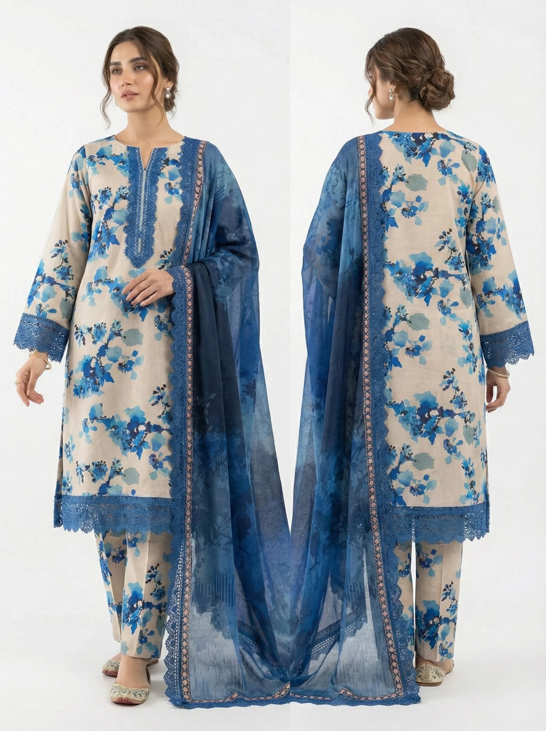Unstitched 3-piece suit with a complete, graceful look and refined detailing.